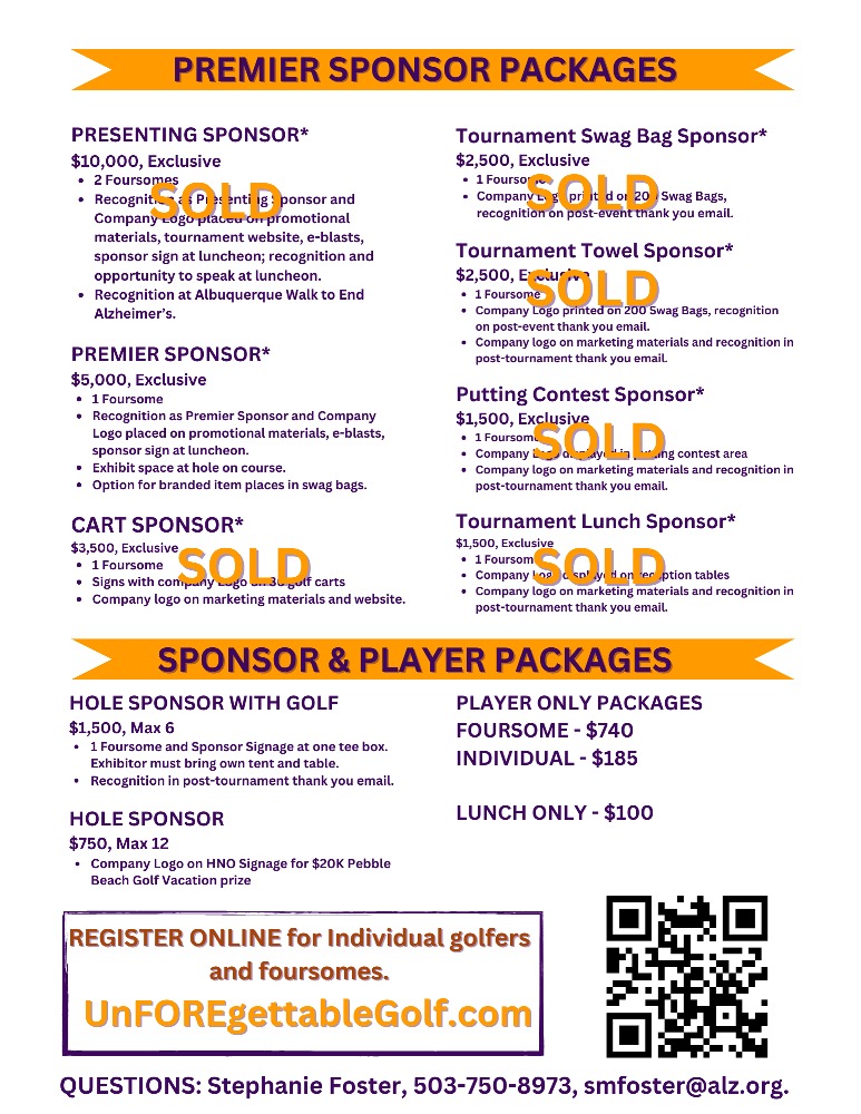Let's fill the course! Please forward this email to your vendors, partners, clients, friends and family who may be interested in one of our sponsorship or player packages. We will pair related groups so you’re playing back-to-back throughout the day! Questions? Contact Stephanie Foster at smfoster@alz.org or 503-750-8983.